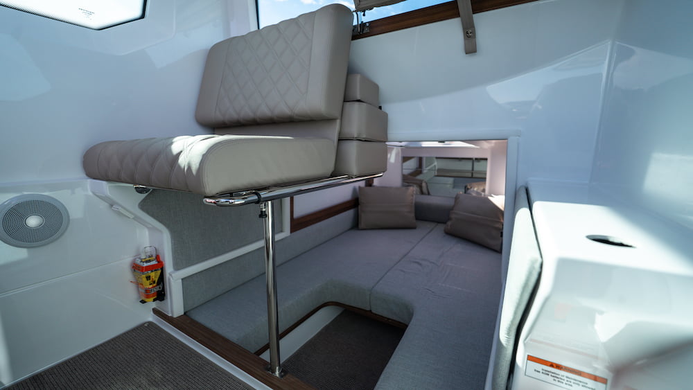 Inside, the cabin is highly adaptable, with multiple seating configurations to suit any occasion. You can set it up with forward-facing seats, create a cozy social space where all seats face each other, or even convert the area into a neat double bed for overnight stays. The aft cabin offers additional sleeping space, comfortably accommodating up to four people, making it ideal for family adventures.