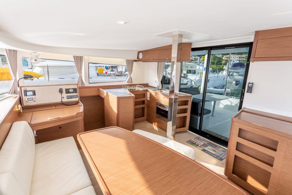 This model features the latest model facelift, walnut interior and contrasting smart shark upholstery. Included in the package is; airconditioning, generator, water maker, extra cockpit refrigerator, sunbathing area on the roof, TV in the saloon and owners suite. With a double berth in saloon and extra bow sleeping area, you can now sleep up to 9 guests onboard.